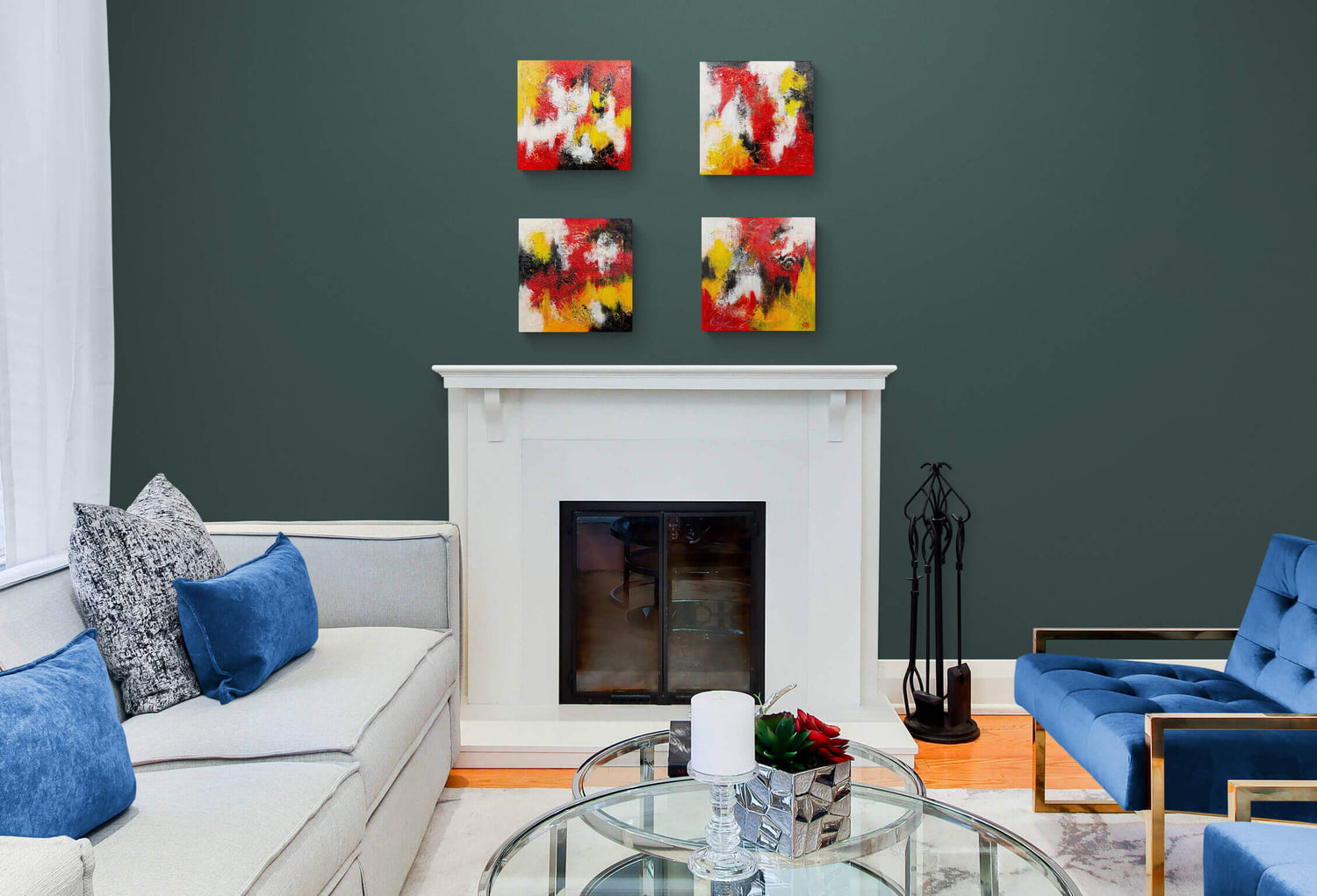 All 12 pieces have a very similar strong colour story but without each being the exact same - each piece has their own identity. This I find really fascinating - despite using the same materials on each 4-piece bundle - and also across the entire whole 12-piece collection - each 12"x12" painting looks unique and has its own essence and radiance.