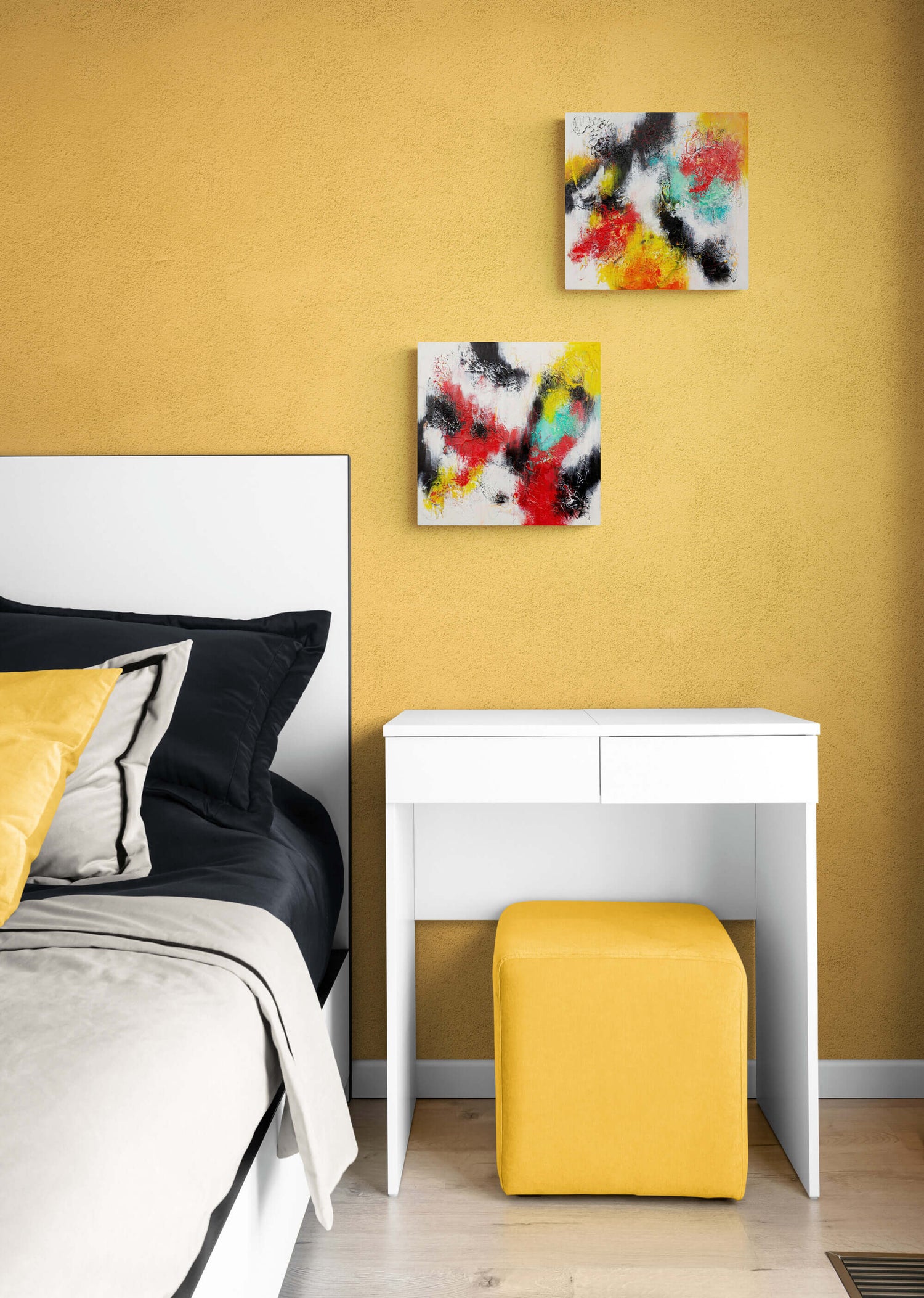 All 12 pieces have a very similar strong colour story but without each being the exact same - each piece has their own identity. This I find really fascinating - despite using the same materials on each 4-piece bundle - and also across the entire whole 12-piece collection - each 12"x12" painting looks unique and has its own essence and radiance.